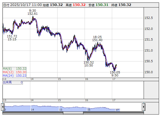 2025年10月17日11時01分 【通貨】外為:1ドル150円31銭前後と大幅なドル安・円高で推移 米ドル/円 <5分足> 「株探」多機能チャートより 17日の外国為替市場のドル円相場は午前11時時点で1ドル=150円31銭前後と、前日午後5時時点に比べ92銭の大幅なドル安・円高。ユーロ円は1ユーロ=175円89銭前後と33銭のユーロ安・円高で推移している。 株探ニュース