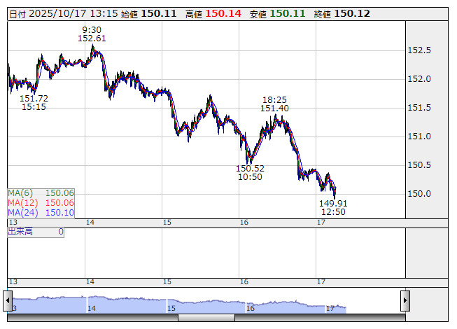 米ドル/円 <5分足> 「株探」多機能チャートより17日午後の東京市場でドル・円は150円を下抜け、149円90銭まで下値を切り下げた。149円台は10月6日以来。日経平均株価は後場下げ幅を拡大し、日本株安を嫌気した円買いに振れた。ただ、その後は割安感からドルに買戻しが入り、持ち直した。