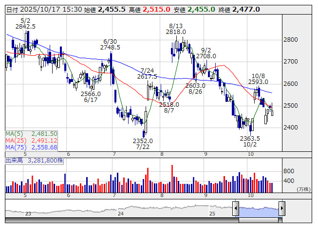 テルモ <日足> 「株探」多機能チャートより■財務省 : 10月17日受付