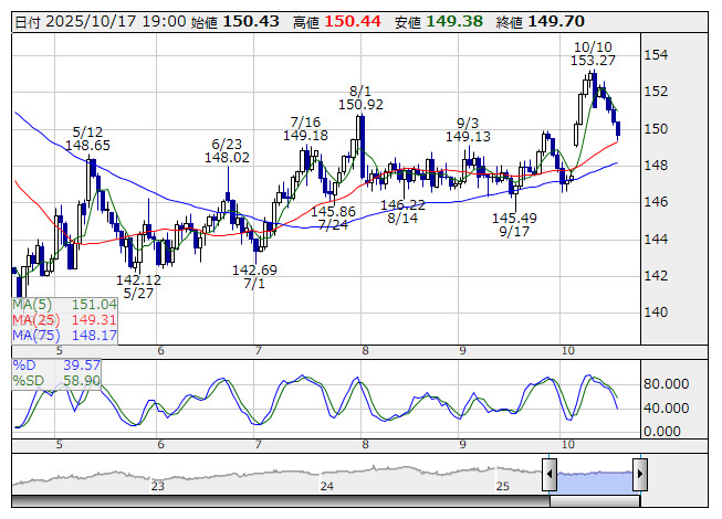 2025年10月17日19時01分 【通貨】外為:1ドル149円67銭前後と横ばい圏で推移 米ドル/円 <日足> Slowストキャス 「株探」多機能チャートより 17日の外国為替市場のドル円相場は午後7時時点で1ドル=149円67銭前後と、午後5時時点に比べ3銭のドル安・円高と横ばい圏。ユーロ円は1ユーロ=175円13銭前後と20銭のユーロ安・円高で推移している。 株探ニュース