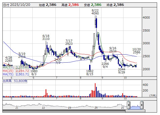 スピー <日足> 「株探」多機能チャートより■スピー <4499> 2,586円 (+500円、+24.0%) ストップ高