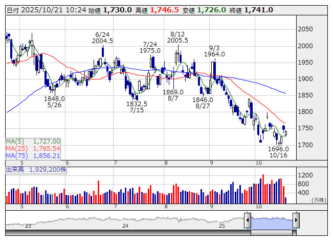 アサヒ <日足> 「株探」多機能チャートより■財務省 : 10月21日受付