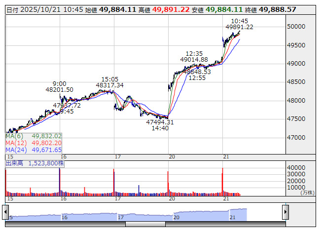 2025年10月21日10時46分 【市況】日経平均の上げ幅が700円突破 日経平均 <5分足> 「株探」多機能チャートより 日経平均株価の上げ幅が700円を突破。10時45分現在、705.72円高の4万9891.22円まで上昇している。 株探ニュース