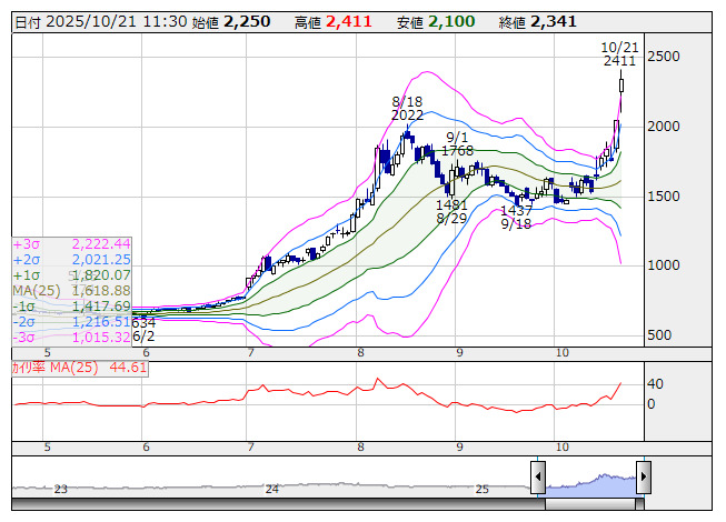 東洋エンジ <日足> ボリンジャー/カイリ率 「株探」多機能チャートより●株価が+3σを上回った銘柄(市場人気順) ★株価の上げ足が速過ぎ、売りが出やすい銘柄