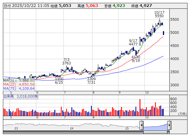 2025年10月22日11時05分 【材料】住友鉱---大幅続落、金価格が過去最大の下落幅に 住友鉱 <日足> 「株探」多機能チャートより 住友鉱<5713>は大幅続落。前日のNY金相場において、NY金先物の中心限月12月物は前日比250.3ドル(5.7%)安の4109.1ドルで取引を終えている。1日の下落幅としては過去最大、下落率も約12年ぶりの大きさとなっている。8月以降の急速な相場上昇に伴う、買いポジションの巻き戻しの動きが強まったもよう。金価格の上昇も材料に8月以降上昇基調が続いていた同社株も、金価格下落に連れ安する状況となっている。 《ST》 提供:フィスコ