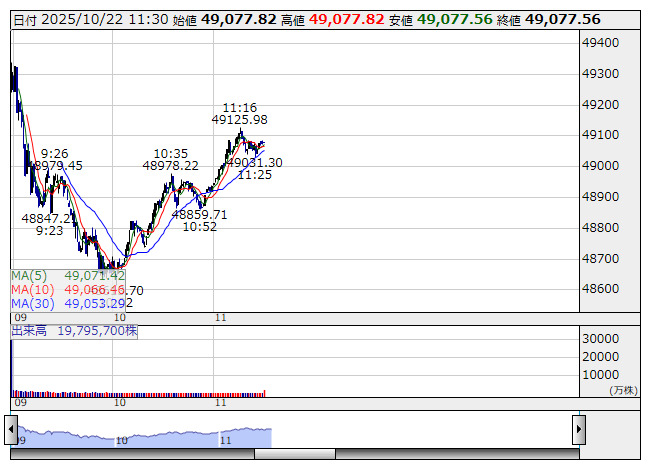日経平均 <1分足> 「株探」多機能チャートより日経平均 : 49077.56 (-238.50)