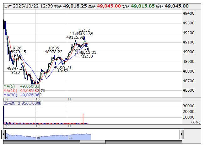 日経平均は反落。238.50円安の49077.56円(出来高概算10億2618万株)で前場の取引を終えている。