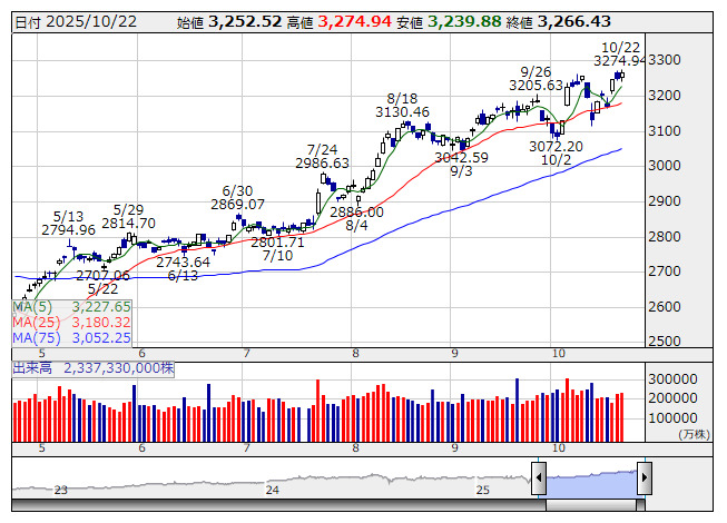 2025年10月23日08時46分 【市況】TOPIX先物:23日寄り付き=18ポイント安、3246.5ポイント TOPIX <日足> 「株探」多機能チャートより 23日8時45分、TOPIX先物期近2025年12月限は前日清算値比18ポイント安の3246.5ポイントで寄り付いた。前日のTOPIXの現物終値3266.43ポイントに対しては19.93ポイント安。 株探ニュース