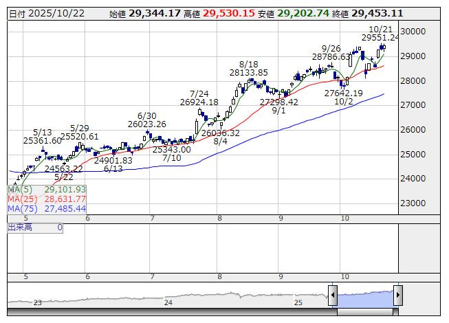 2025年10月23日08時46分 【市況】JPX日経400先物:23日寄り付き=205ポイント安、2万9280ポイント JPX日経400 <日足> 「株探」多機能チャートより 23日8時45分、JPX日経インデックス400先物期近2025年12月限は前日清算値比205ポイント安の2万9280ポイントで寄り付いた。前日のJPX日経インデックス400の現物終値2万9453.11ポイントに対しては173.11ポイント安。 株探ニュース