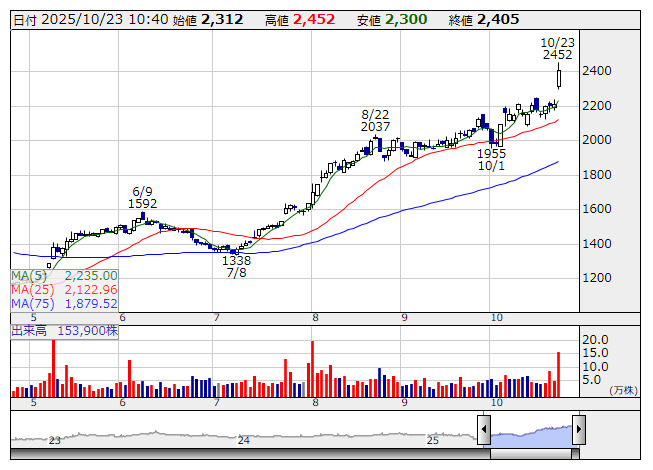 2025年10月23日10時41分 【材料】平河ヒューテ---大幅続伸、アクシウムの大株主浮上を材料視 平河ヒューテ <日足> 「株探」多機能チャートより 平河ヒューテ<5821>は大幅続伸。前日に提出された大量保有報告書によると、アクシウム・キャピタルの保有比率が5.52%となり、新たに大株主に浮上したことが明らかになっている。保有目的は純投資としている。アクシウムは7月に始動した中小型株投資のファンドであり、これまで、フォスター電機や東京コスモス電機などに投資実績。なお、CEHDも同様にアクシウムの大株主浮上が新たに明らかになっている。 《ST》 提供:フィスコ