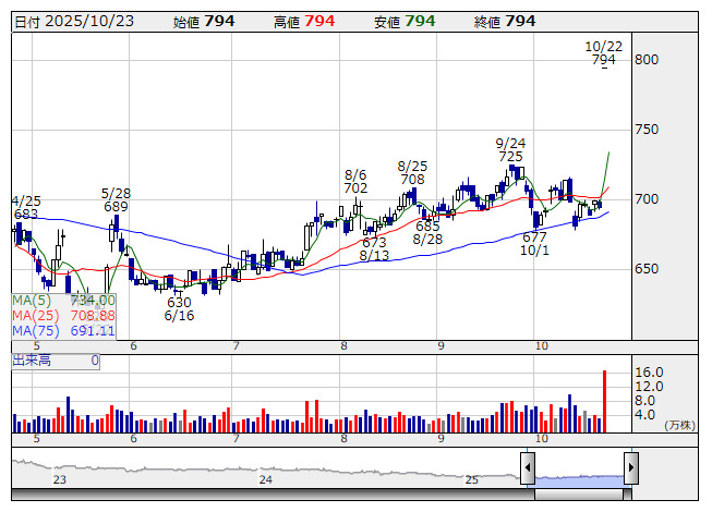 稀元素 <日足> 「株探」多機能チャートより23日前場 ストップ高: 6銘柄 ストップ安: 1銘柄 (気配、一時を含む)