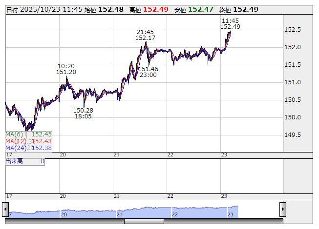 米ドル/円 <5分足> 「株探」多機能チャートより23日午前の東京市場でドル・円は強含み、152円40銭台で推移。151円82銭から152円49銭まで値を上げている。株安は一服しており、円買いは縮小しているようだ。ユーロ・ドルは伸び悩み、1.1614ドルから1.1595ドルまで下落。ユーロ・円は反転、176円31銭まで売られた後、176円84銭まで戻す展開。