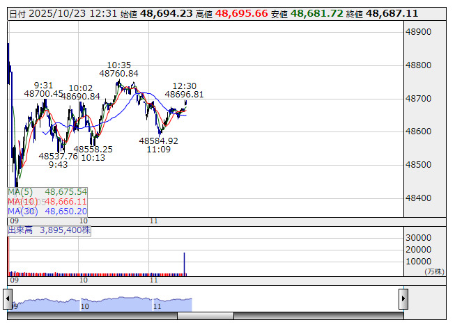 2025年10月23日12時31分 【市況】東京株式(後場寄り付き)=日経平均株価は前場終値比でやや下げ幅縮小 日経平均 <1分足> 「株探」多機能チャートより 後場寄り付きの東京株式市場では、日経平均株価が前日比625円安前後と前場終値からやや下げ幅を縮小。外国為替市場では、1ドル=152円40銭台での値動きとなっている。 出所:MINKABU PRESS