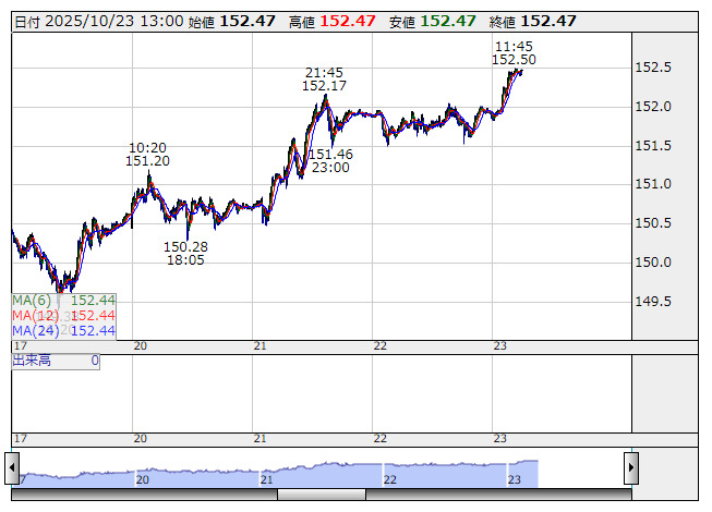 2025年10月23日13時01分 【通貨】外為:1ドル152円47銭前後と大幅なドル高・円安で推移 米ドル/円 <5分足> 「株探」多機能チャートより 23日の外国為替市場のドル円相場は午後1時時点で1ドル=152円47銭前後と、前日午後5時時点に比べ65銭の大幅なドル高・円安。ユーロ円は1ユーロ=176円76銭前後と63銭の大幅なユーロ高・円安で推移している。 株探ニュース