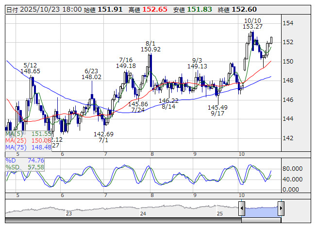 2025年10月23日18時01分 【通貨】外為:1ドル152円61銭前後とドル高・円安で推移 米ドル/円 <日足> Slowストキャス 「株探」多機能チャートより 23日の外国為替市場のドル円相場は午後6時時点で1ドル=152円61銭前後と、午後5時時点に比べ11銭のドル高・円安。ユーロ円は1ユーロ=176円96銭前後と6銭の小幅なユーロ高・円安で推移している。 株探ニュース