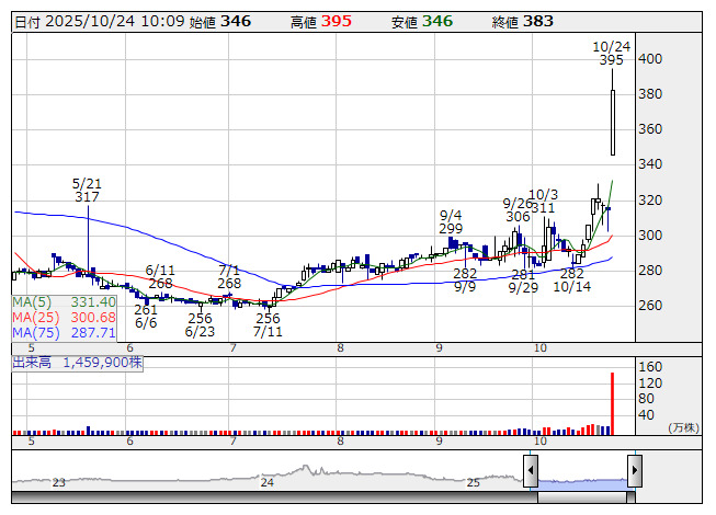 4960>が急速人気化、前日比80円高はストップ高となる395円まで一気に値を飛ばす場面があった。化学品メーカーで紫外線吸収剤や酸化防止剤などの添加剤や製紙用薬剤(顕色剤)、有機EL材料など電子材料にも展開する。商品開発力が高く、ペロブスカイト太陽電池材料の開発推進を標榜している点も注目ポイントといえる。産業技術総合研究所の「被災地企業等再生可能エネルギー技術シーズ開発・事業化支援事業」に採択されるなど実績を重ねている。ペロブスカイト太陽電池は国策支援の見込まれる分野で、高市早苗首相が総裁選で掲げた公約にもペロブスカイトの普及促進が盛り込まれており、きょう午後に予定される所信表明演説を前に思惑が募っている。