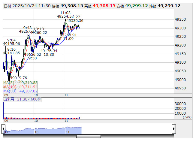 日経平均 <1分足> 「株探」多機能チャートより日経平均 : 49299.12 (+657.51)