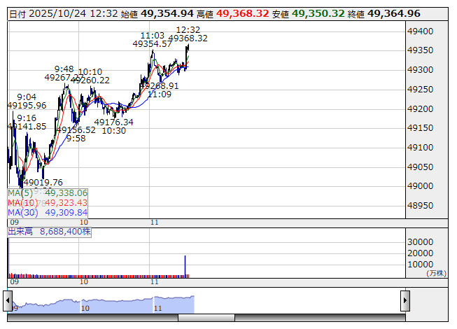 2025年10月24日12時31分 【市況】東京株式(後場寄り付き)=日経平均株価は前場終値比で横ばい 日経平均 <1分足> 「株探」多機能チャートより 後場寄り付き直後の東京株式市場では、日経平均株価が前営業日比670円高前後と前場終値と比較して横ばい圏推移。外国為替市場では1ドル=152円80銭台の推移。アジアの主要株式市場は高安まちまち。 出所:MINKABU PRESS