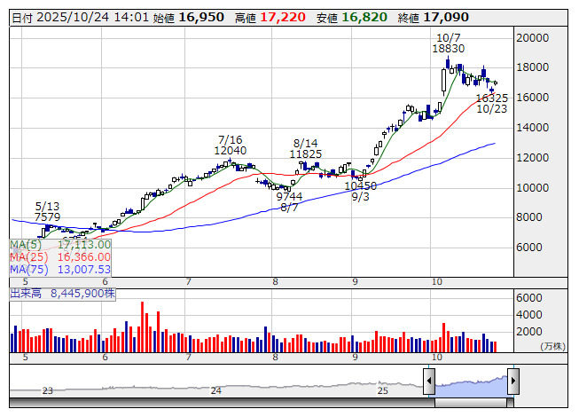 アドテスト <日足> 「株探」多機能チャートより※決算発表の集中期間(10月24日~11月14日)は、『決算特報』を毎日3本配信します。