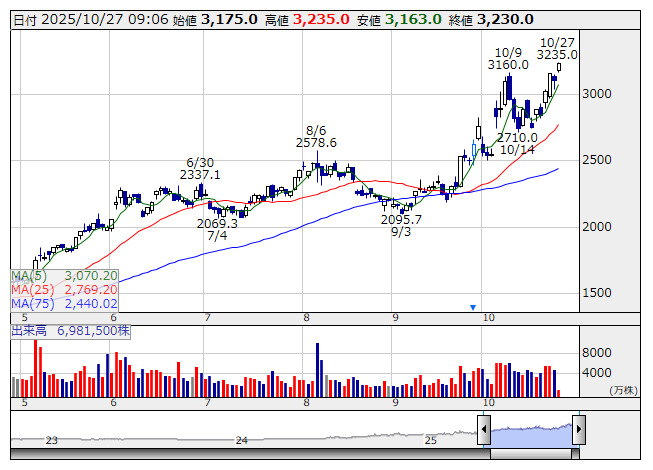 IHI <日足> 「株探」多機能チャートより本日取引開始後、特別気配を2回引き上げた9時6分現在の約定回数ランキング上位50社を取り上げた。常に約定回数が多い主力大型株に混じり、買い材料の現出などでランクインする新興市場の中小型株が注目される。