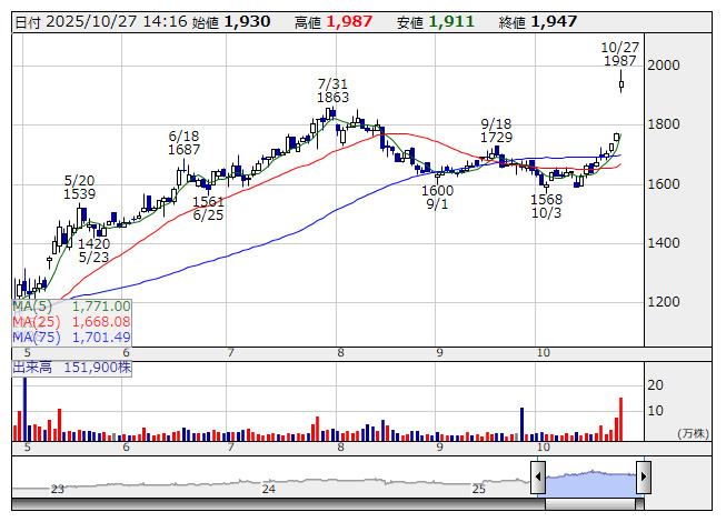 9029>は大幅続伸。先週末に上半期の決算を発表、営業利益は18.6億円で前年同期比68.3%増となり、従来予想の14.3億円を大きく上回る着地になっている。つれて、通期予想は従来の29.6億円から32.6億円、前期比18.8%増に上方修正。年間配当金も従来計画の46円から50円に引き上げている。、大手EC向け大型3PLセンターである川西LC、神戸西LC、流山LC、鳴尾浜LCの事業が順調に拡大のほか、大手EC向け輸送業務も想定超の輸送量に。