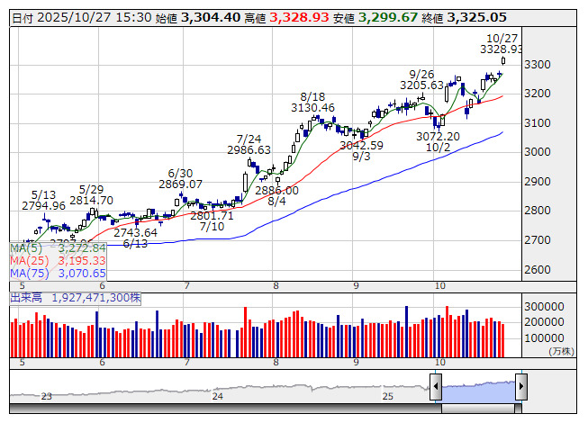 2025年10月27日15時47分 【市況】TOPIX先物:27日清算値=58.5ポイント高、3331.5ポイント TOPIX <日足> 「株探」多機能チャートより 27日15時45分、TOPIX先物期近2025年12月限は前週末清算値比58.5ポイント高の3331.5ポイントで取引を終えた。出来高は4万4581枚だった。この日のTOPIXの現物終値3325.05ポイントに対しては6.45ポイント高。 株探ニュース