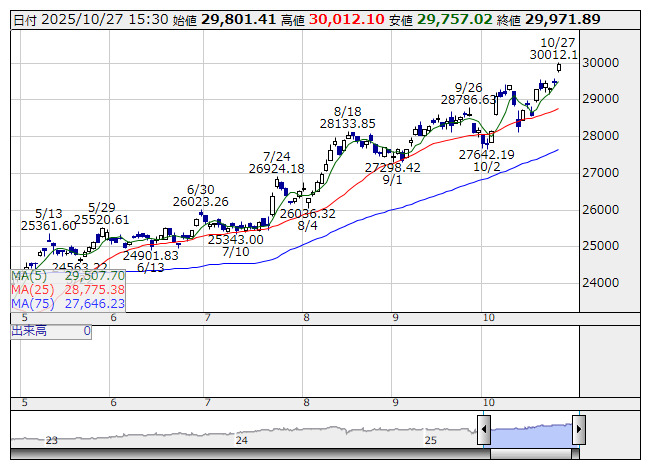 2025年10月27日15時47分 【市況】JPX日経400先物:27日清算値=565ポイント高、3万60ポイント JPX日経400 <日足> 「株探」多機能チャートより 27日15時45分、JPX日経インデックス400先物期近2025年12月限は前週末清算値比565ポイント高の3万60ポイントで取引を終えた。出来高は2541枚だった。この日のJPX日経インデックス400の現物終値2万9971.89ポイントに対しては88.11ポイント高。 株探ニュース