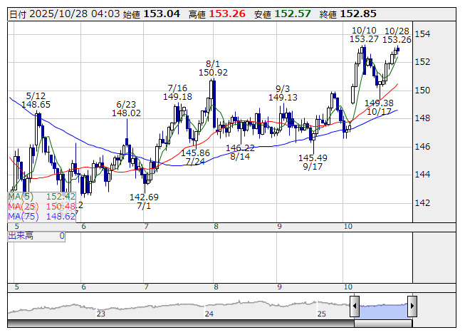 米ドル/円 <日足> 「株探」多機能チャートより27日のニューヨーク外為市場でドル・円は152円57銭まで下落後、153円20銭まで上昇し、引けた。