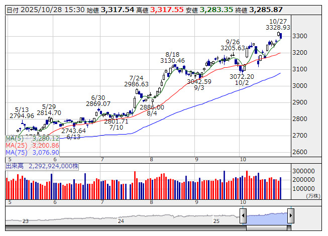 2025年10月28日15時47分 【市況】TOPIX先物:28日清算値=36.5ポイント安、3295ポイント TOPIX <日足> 「株探」多機能チャートより 28日15時45分、TOPIX先物期近2025年12月限は前日清算値比36.5ポイント安の3295ポイントで取引を終えた。出来高は4万9042枚だった。この日のTOPIXの現物終値3285.87ポイントに対しては9.13ポイント高。 株探ニュース