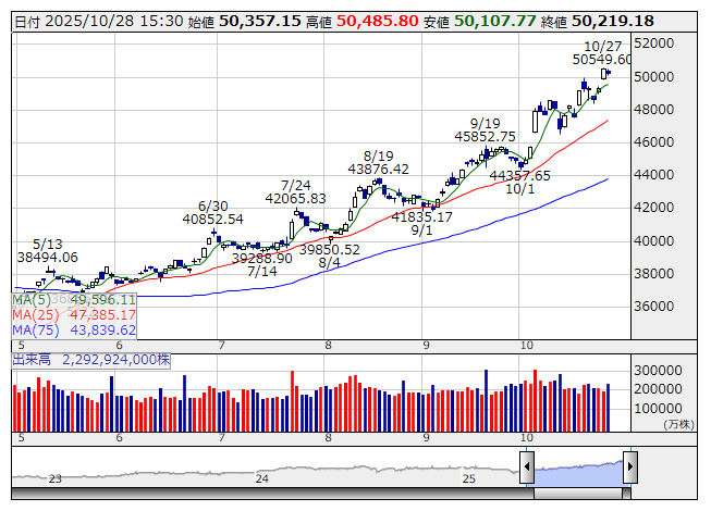 日経平均 <日足> 「株探」多機能チャートより今週は早くも10月の最終週ということで、残るは11月と12月の2カ月であり、2025年相場も最終コーナーを曲がっていよいよ最後の直線勝負に突入するようなイメージとなってきた。今年は4月に昨年8月のフラッシュクラッシュの再現を思わせる暴落に見舞われ、日経平均は3万1000円近辺まで水準を切り下げたのだが、ここは結果的に天与の買い場となった。それにしてもそこからわずか半年余りで日経平均が5万円の大台に乗せるというのは、誰一人想像できなかったはずである。ちなみに、NYダウは4月上旬に3万7600ドル台まで下げ、その後は一貫した戻り相場を形成したが、直近は最高値圏に位置するものの4万7000ドル台半ばの水準にとどまっている。日経平均のリバウンドの強烈さが改めて浮き彫りとなっている。