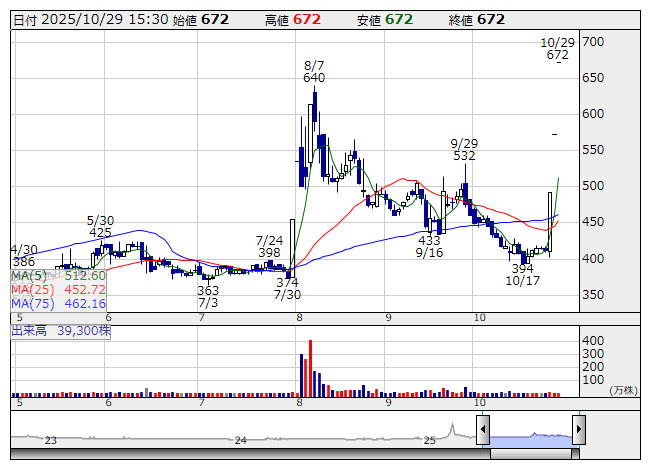 ジェネパ <日足> 「株探」多機能チャートより29日大引け ストップ高: 9銘柄 ストップ安: 0銘柄 (気配、一時を含む)