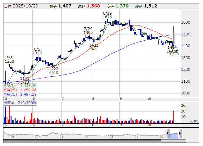SBIIG <日足> 「株探」多機能チャートより10月29日に、株主優待制度について発表した銘柄を取り上げた。