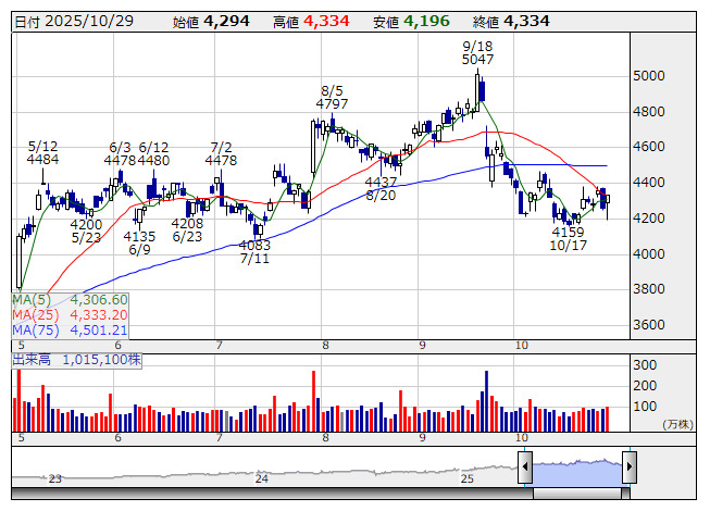 <5713> 住友鉱 6863 ( 13) 4,977 +57 ( +1.2%)