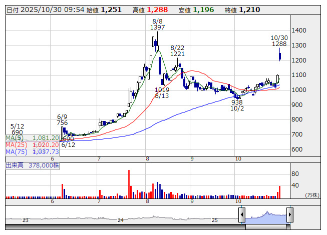 253A>は急騰、一時17%近い上昇で1288円まで上値を伸ばす場面があった。元来急騰習性を持つ銘柄だが、8月8日に1397円の年初来高値をつけてからは調整局面に移行し、8月下旬以降は1100円近辺をボックス上限とするもみ合いを長く続けていた。ここデータセンター関連株の人気が再燃し電力設備増強の必要性などに改めてスポットが当たったことから、同社株にも満を持して投資マネーが流れ込んでいる。同社は電気設備や送電線工事などを手掛け、電気工事は基礎工事から鉄塔建設、架線構築までワンストップで対応し需要獲得が進んでいる。足もとデータセンター向け特別高圧受変電設備関連などの大型案件が急増しており、今後データセンター建設ラッシュが見込まれるなか、中期的にも受注環境は良好だ。株式需給面では8月急騰時に貸株市場を通じて積み上げられた空売りが一部放置された状態とみられ、その買い戻しも物色人気を助長したようだ。