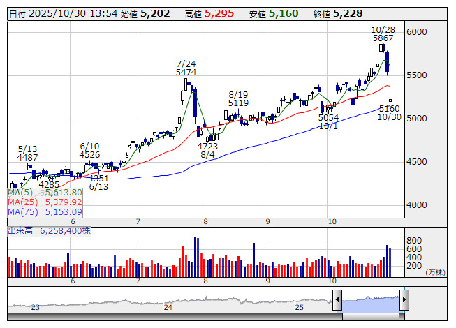6301>は大幅続落。前日に第2四半期の決算を発表、7-9月期営業利益は1367億円で前年同期比6.7%減となったが、ほぼ市場予想線上とみられる。一方、通期予想は従来の4780億円から5000億円、前期比23.9%減に上方修正しているものの、コンセンサスは5600億円程度の水準であり、修正幅は想定より小幅にとどまったとの見方が優勢。インドネシア需要の減退などが意識されているもよう。値上げによる今後の米国販売の動向も不透明との見方。