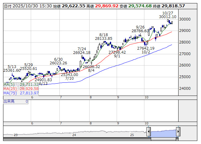 2025年10月30日15時47分 【市況】JPX日経400先物:30日清算値=305ポイント高、2万9910ポイント JPX日経400 <日足> 「株探」多機能チャートより 30日15時45分、JPX日経インデックス400先物期近2025年12月限は前日清算値比305ポイント高の2万9910ポイントで取引を終えた。出来高は3629枚だった。この日のJPX日経インデックス400の現物終値2万9818.57ポイントに対しては91.43ポイント高。 株探ニュース