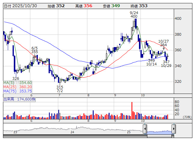 タカミヤ <日足> 「株探」多機能チャートより寄り付き前の注文【板状況】に基づいた情報|10月31日 8時35分11秒現在