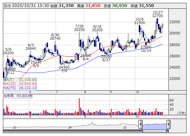 伊勢化 <日足> 「株探」多機能チャートよりまた、25年12月期の連結業績予想について、売上高を375億円から380億円(前期比14.2%増)へ、営業利益を80億円から90億円(同17.5%増)へ、純利益を54億円から61億円(同20.3%増)へ上方修正し、期末配当予想を190円から200円(年390円)へ引き上げた。ヨウ素製品の販売数量が計画を下回っているものの、ヨウ素の国際市況が想定を上回る水準で推移していることに加え、為替相場が想定よりも円安となっていることが要因としている。