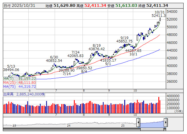 日経平均 <日足> 「株探」多機能チャートより55040.18円 ボリンジャーバンド3σ