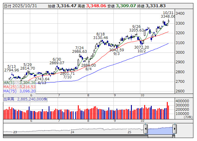 TOPIX <日足> 「株探」多機能チャートより3439.34ポイント ボリンジャーバンド3σ