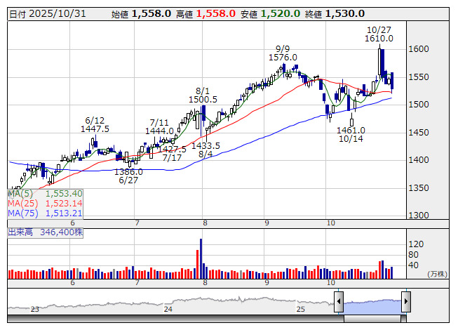 東合成 <日足> 「株探」多機能チャートより10月27日から31日の期間に、株主優待制度について新設や拡充などを発表した銘柄を取り上げた。