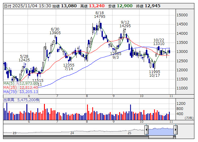 任天堂 <日足> 「株探」多機能チャートより※決算発表の集中期間(10月24日~11月14日)は、『決算特報』を毎日3本配信します。