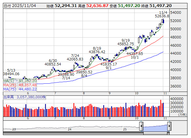 5日の東京株式市場は、前日に続き日経平均株価、TOPIXともに下値を探る展開となることが予想される。10月は大方の予想を大幅に上回る強調相場が続いたが、11月相場入りとともに、その反動が出るタイミングとなっている。前日に900円あまりの大幅調整を入れた日経平均だが、時価は依然としてPER換算で19倍台に位置しており、投資指標面からは割高感が拭い切れない。きょうは5万1000円近辺まで水準を切り下げる場面も想定される。前日の欧州株市場では、全体としては高安まちまちながら独DAX、仏CAC40はいずれも下落した。直接的に目立った悪材料は見当たらないものの、米株市場でハイテク株に調整圧力が顕在化しており、それを横目に買い手控えムードが強まった。米国株市場では、これまで上昇相場を主導してきたAI関連銘柄に利食い急ぎの動きが観測される状況となっている。この日はNYダウが終盤下げ渋ったとはいえ一時460ドル下落する場面があった。また、ハイテク株比率の高いナスダック総合株価指数は相対的に下げがきつく、一時500ポイントを超える下げで下落率は2%を上回った。前日の引け後にコンセンサスを上回る好決算を発表したビッグデータ分析のパランティアテクノロジーズ<