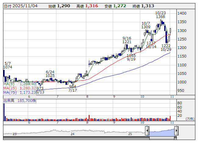 TOA <日足> 「株探」多機能チャートより寄り付き前の注文【板状況】に基づいた情報|11月5日 8時35分02秒現在