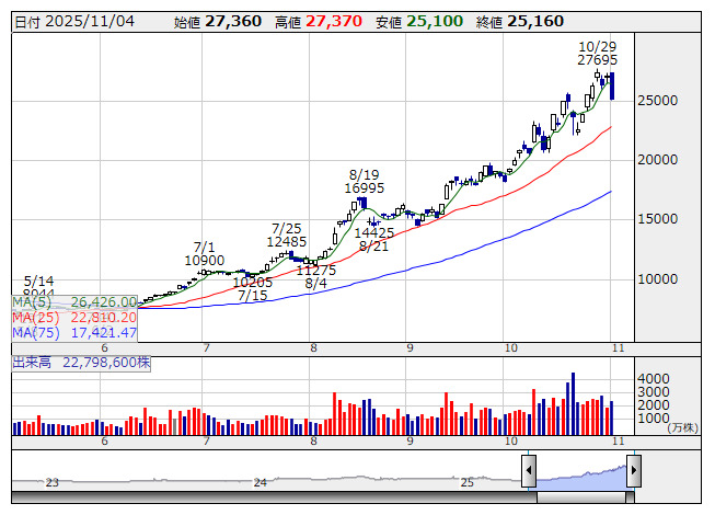 <6920> レーザーテク 214813 ( 76) 28,005 -2,765 ( -9.0%)