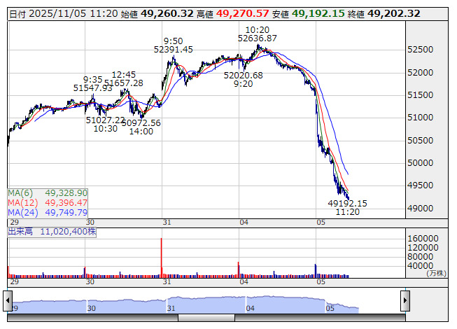 2025年11月05日11時23分 【市況】日経平均の下げ幅が2300円を超える 日経平均 <5分足> 「株探」多機能チャートより 日経平均株価の下げ幅が2300円を超えた。11時22分現在、2305.05円安の4万9192.15円まで下落している。 株探ニュース