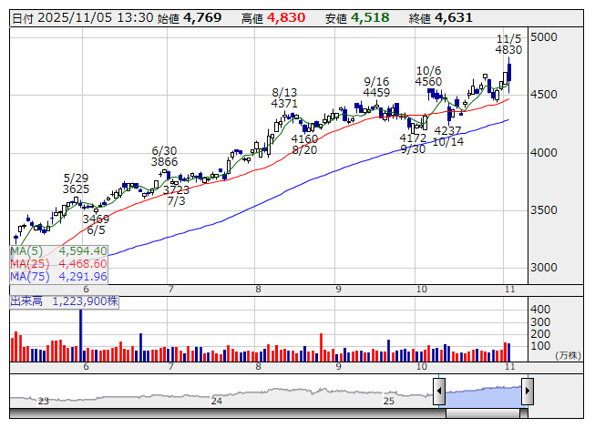 横河電 <日足> 「株探」多機能チャートより主に欧州、日本、東南アジアでの大口案件の受注増加に伴い、制御事業の売上高が増加していることに加えて、前提となる為替レートを1ドル=140円から145円へ見直したことが要因としている。なお、同時に発表した9月中間期決算は、売上高2819億9600万円(前年同期比5.8%増)、営業利益389億8800万円(同7.4%増)、純利益293億7100万円(同19.5%増)だった。