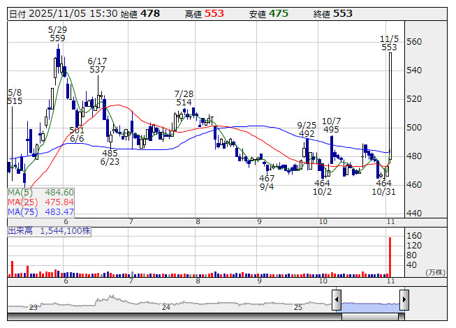 免疫生物研 <日足> 「株探」多機能チャートより個別では免疫生物研究所<4570>がストップ高。豆蔵<202A>、Aiロボティクス<247A>、技術承継機構<319A>、ユニフォームネクスト<3566>、NE<441A>など8銘柄は年初来高値を更新。Heartseed<219A>、イオレ<2334>、メディア総研<9242>、ユーソナー<431A>、令和アカウンティング・ホールディングス<296A>は値上がり率上位に買われた。