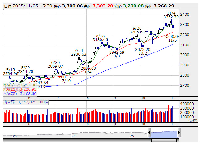 TOPIX <日足> 「株探」多機能チャートより日本取引所が公表した先物手口情報によると、11月5日のTOPIX先物期近(2025年12月限)の日中取引(立会内・J-NETの合算)で、取引高トップはABNクリアリン証券の5万7665枚だった。