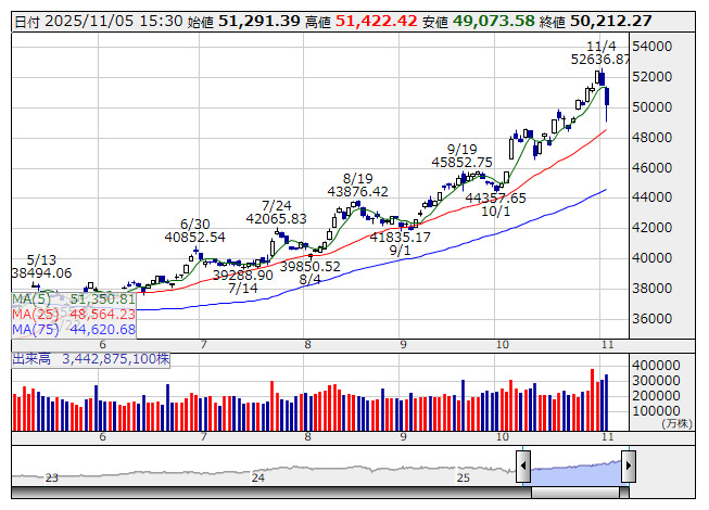 日経平均 <日足> 「株探」多機能チャートより日本取引所が公表した先物手口情報によると、11月5日の日経225先物期近(2025年12月限)の夜間取引(立会内・J-NETの合算)で、取引高トップはABNクリアリン証券の1万1290枚だった。